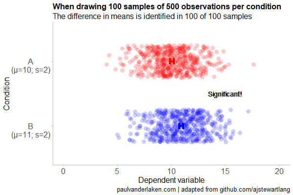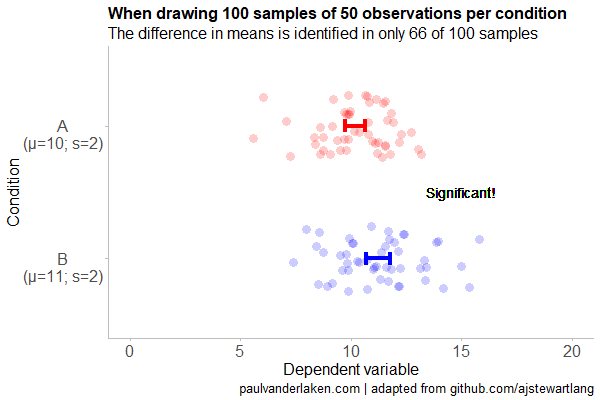 You can see this in the distributions Andrew sampled from in the tweet above. The data for conditions A (red) and B (blue) are sampled from the same distribution, with mean 10 and standard deviation 2. While there should thus be no difference between the groups, small samples may cause researchers to erroneously conclude that there is a difference between conditions A and B due to the observed data.