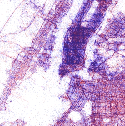 Blue dots represent iOS (Apple iPhones) and seem to cluster in the downtown area’s whereas red Android phones dominate the zones further from the city centres. Did you notice something else? Recall that Umar used a blank canvas, not a map from Google. Nevertheless, in all visualizations the road network is clearly visible. Umar guesses that passengers (hopefully not the drivers) often Shazam music playing in the car.