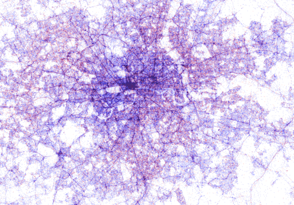 This required quite complex code, the details of which are in his blog. For now, here is another, beautiful map of England, with (the density of) Shazam recognitions reflected by color intensity on a dark background.