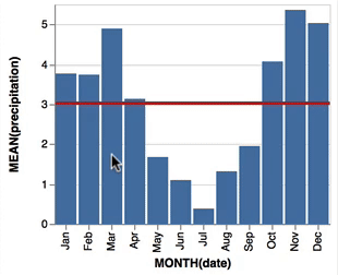 Vega-Lite 2 is especially useful because of the included interaction options. Programmers can specify how users can interactive select the data in their visualizations (e.g., a point or interval selection), along with possible transformations. With these interactions, users can for instance filter data, highlight points, or pan or zoom a plot. The plot below uses an interval selection, which causes the chart to include an interactive brush (shown in grey). The brush selection parameterizes the red guideline, which visualizes the average value within the selected interval.