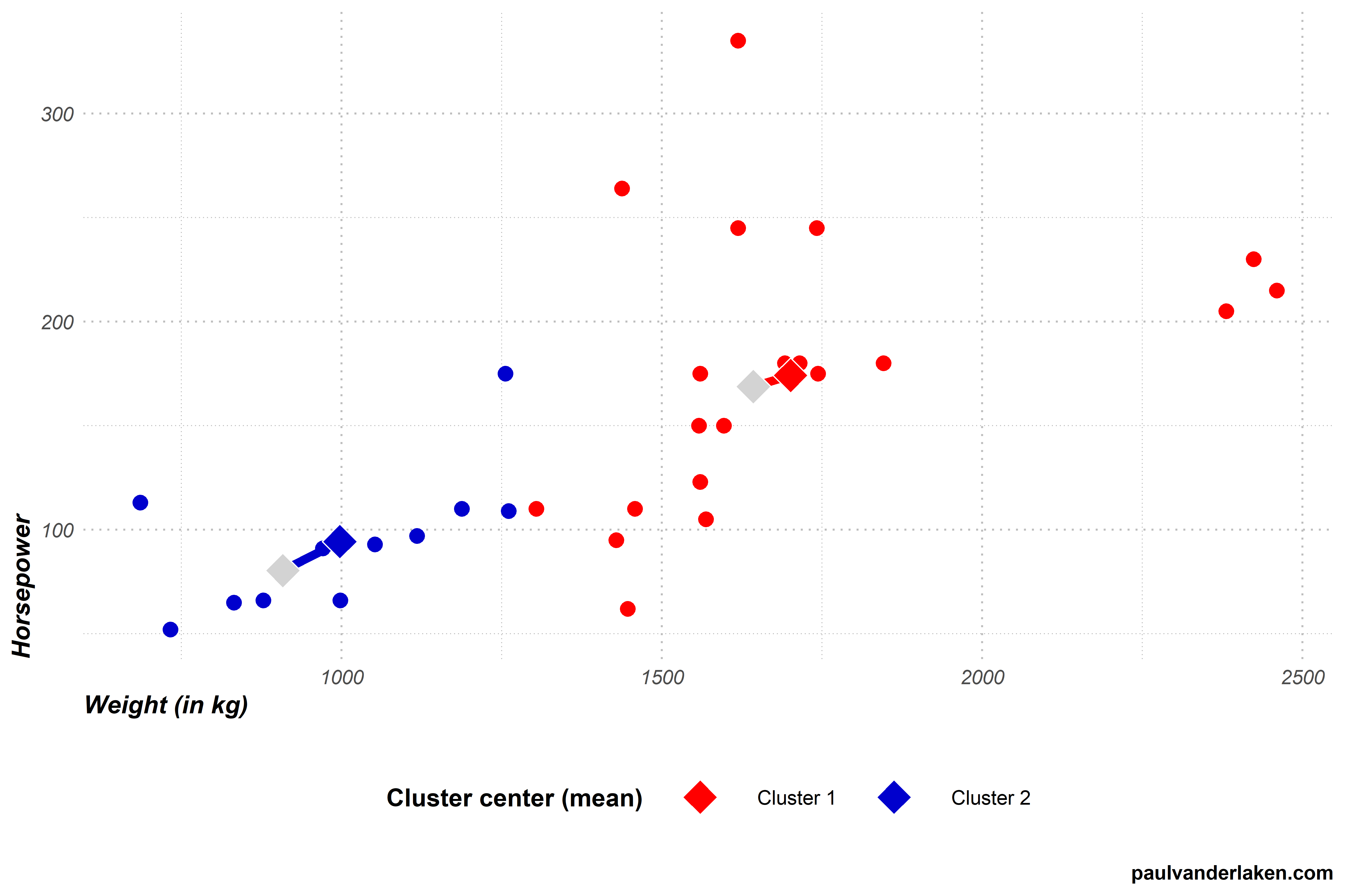 So for each cluster, the algorithm takes the observations assigned to it, and calculates the cluster’s mean value for every variable. In our case, the algorithm thus calculates 4 means: the average weight and the average horsepower, for each of our two clusters.