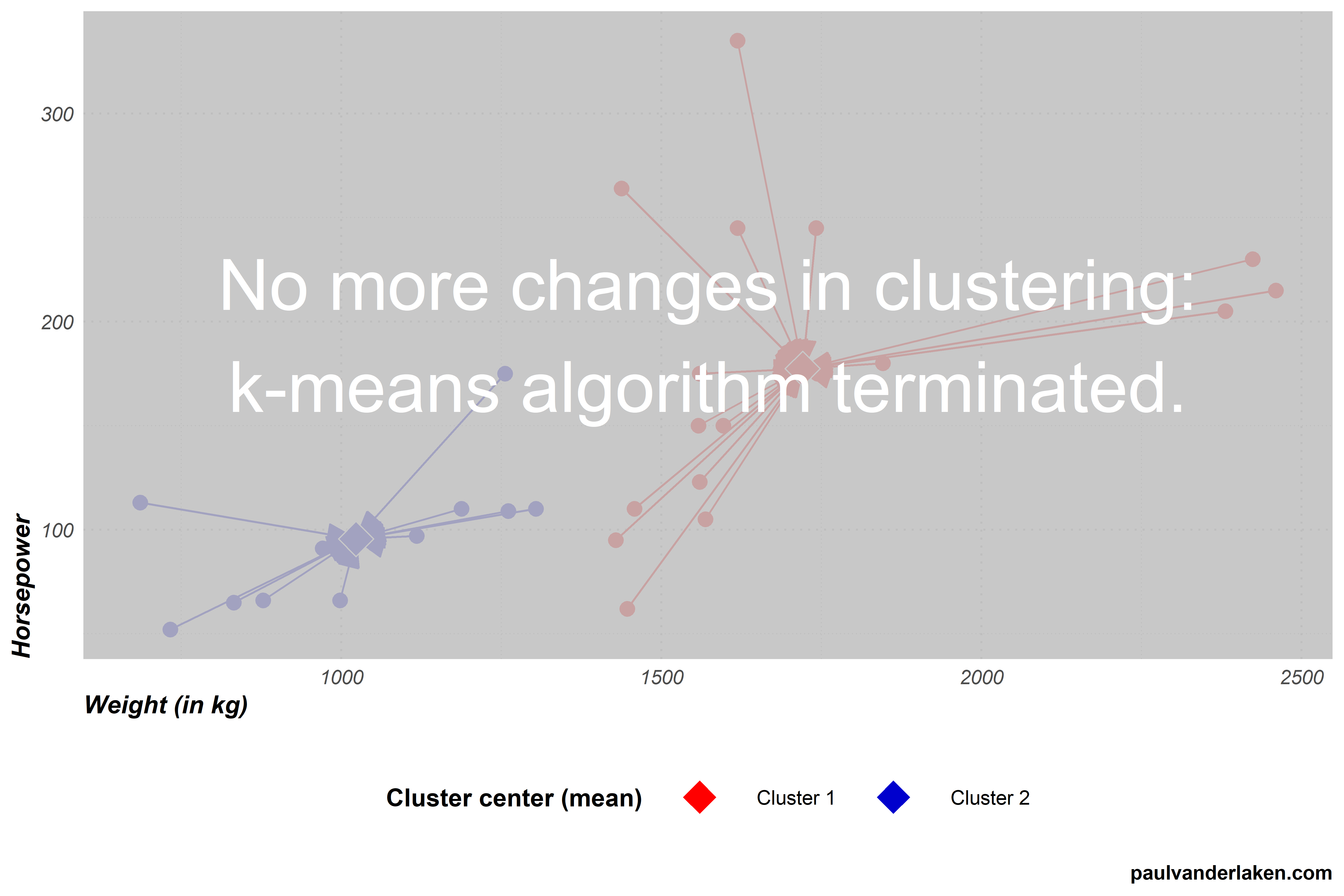 If that is the case, then every observation is assigned to the group whose center values best represent its underlying characteristics (weight and horsepower), and the k-means algorithm is thus satisfied with the solution given this number of groups (= k). These groups centers now best describe the characteristics of the individual observations at hand, given this k, as evidenced that each observations belongs to the cluster whose center values are closest to their own values.