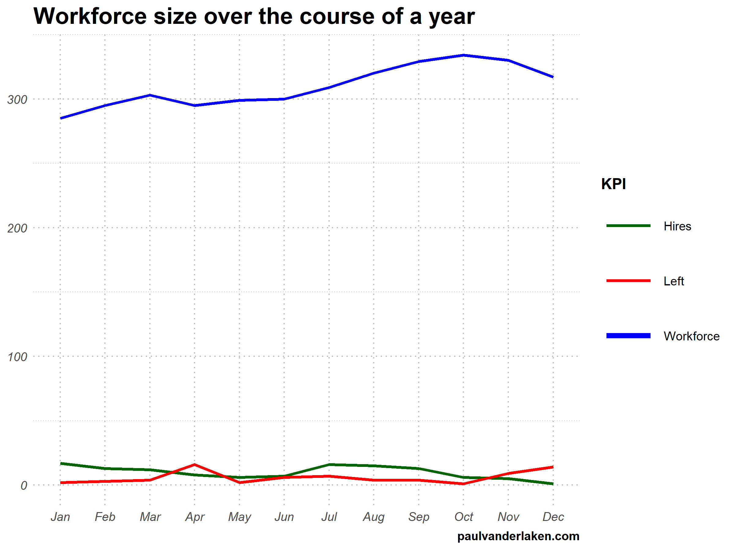 # VISUALIZE & ANIMATE #### # draw workforce plot ggplot(wf_long, aes(x = month, y = value, group = variable)) + geom_line(aes(col = variable, size = variable == "workforce")) + scale_color_manual(values = COLORS) + scale_size_manual(values = c(LINE_SIZE2, LINE_SIZE1), guide = FALSE) + guides(color = guide_legend(override.aes = list(size = c(rep(LINE_SIZE2, 2), LINE_SIZE1)))) + # theme_PVDL() + labs(x = NULL, y = NULL, color = "KPI", caption = "paulvanderlaken.com") + ggtitle("Workforce size over the course of a year") + NULL -> workforce_plot