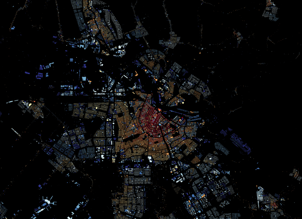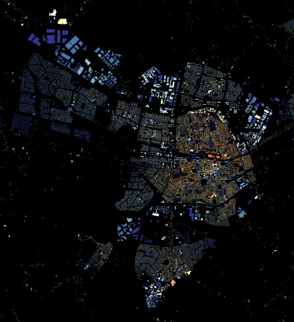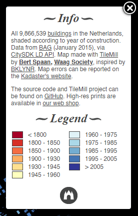 Bert Spaan colorcoded every building in the Netherlands according to their yaer of construction and visualized the resulting map of nearly 10 million buildings in a JavaScript leaflet webpage.