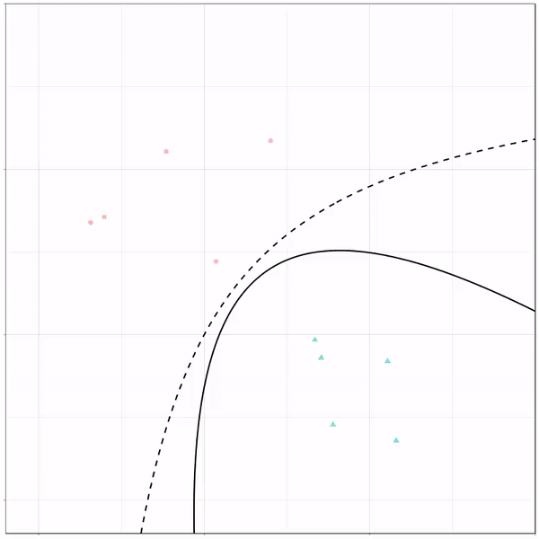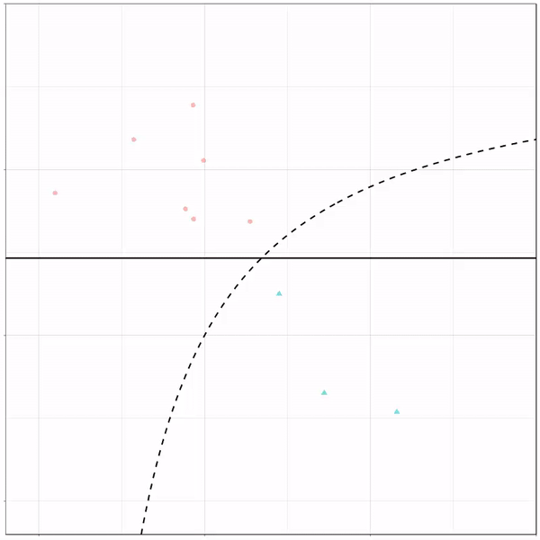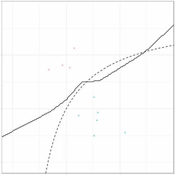 A thread of classifiers learning a decision rule. Dashed line is optimal boundary. Animations with #gganimate by @thomasp85 and @drob. #rstats