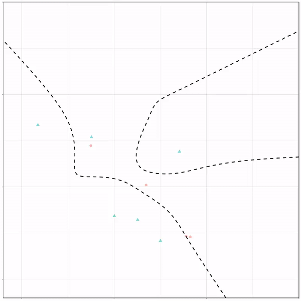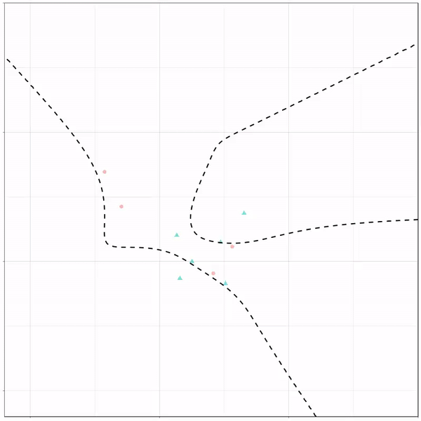 Ryan Holbrook made awesome animated GIFs in R of several classifiers learning a decision rule boundary between two classes. Basically, what you see is a machine learning model in action, learning how to distinguish data of two classes, say cats and dogs, using some X and Y variables.