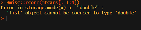 Soon you figure out that Hmisc::rcorr only takes in matrices (thus with only numeric values). Hurray, now you can run a correlation analysis on your dataframe, you think…