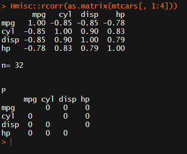 Then there the (in)famous Hmisc package, with its rcorr function. But this tool provides a whole new range of issues.