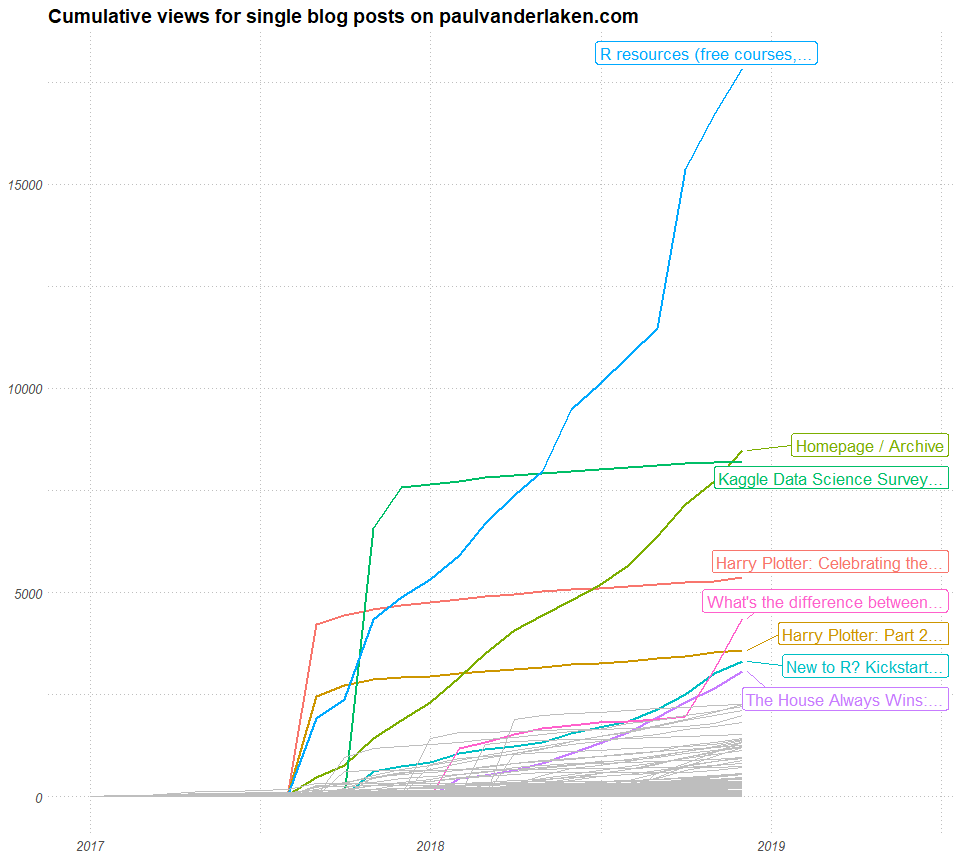 Clearly, most people have been coming for the R resources overview, as demonstrated by the visual below. Moreover, the majority of blog posts has not been visited much — only a handful ever cross the 1000 views mark.