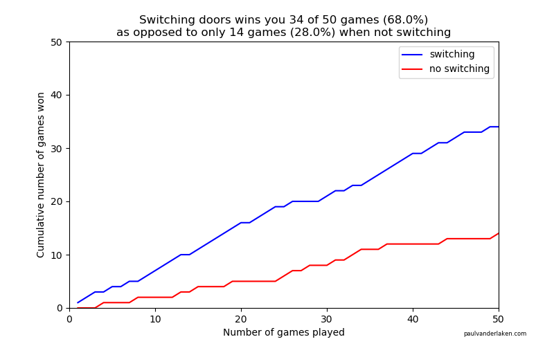 The first script contains a function simulating a single game of Monty Hall. A second script runs this function an X amount of times, and visualizes the outcomes as we play more and more games.