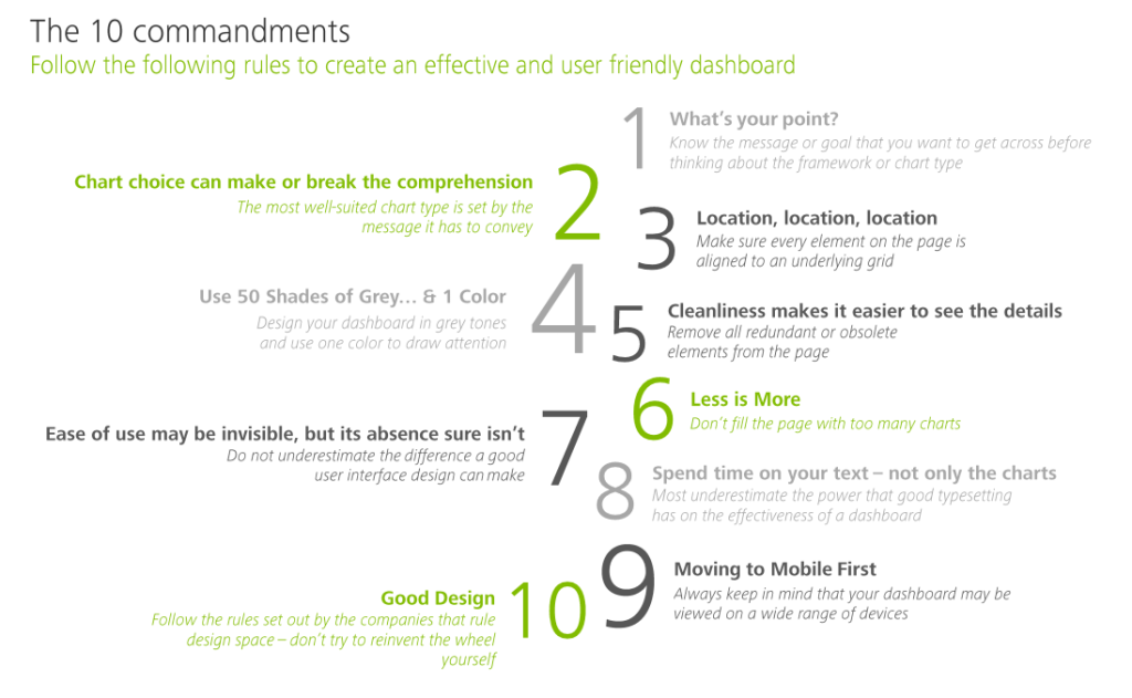 Some of these rules are more generally applicable to data visualization. Yet, the Deloitte 10 commandments form a good checklist when designing a dashboard.